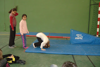 Angelina fait une roulade en avant sur un tapis bleu. Rania et Elvan attendent leur tour. Tous les autres sont passés. |